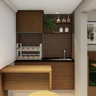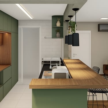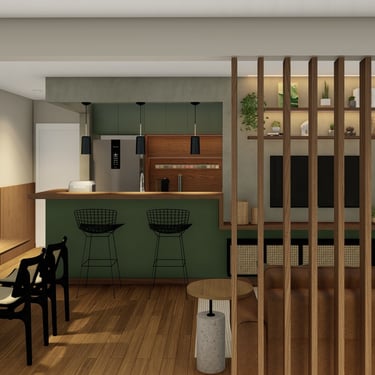 Como a sala, a área gourmet e a cozinha são ambientes integrados, foi utilizada a madeira como protagonista dando sensação de conforto e continuidade visual, para contrastar foi aplicado o verde e o preto, que conferem modernidade e sofisticação