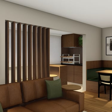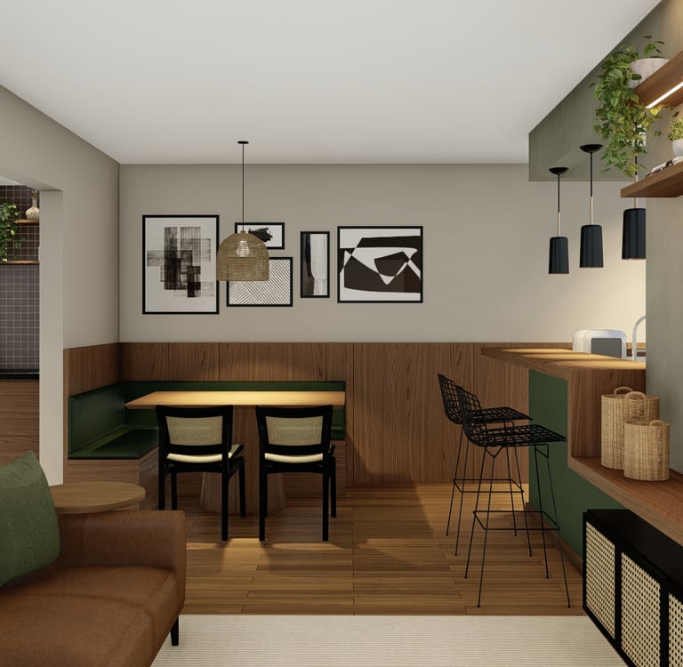É um ambiente que prioriza o bem-estar através de elementos naturais, mas mantém uma estética urbana, organizada e funcional.